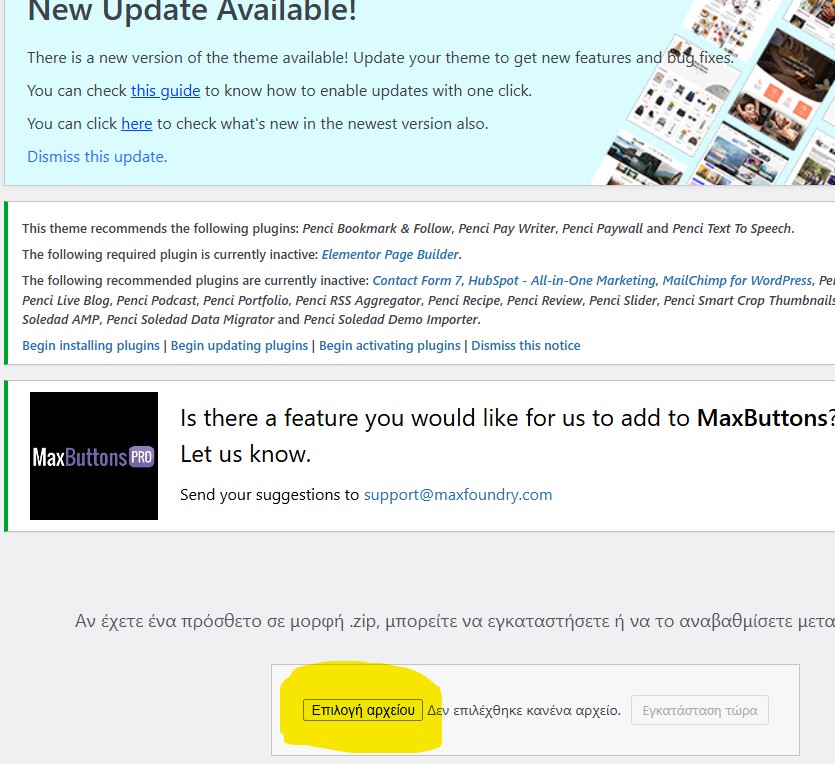 7. Στο παράθυρο που ανοίγει επιλέγετε το συμπιεσμένο αρχείο του πρόσθετου που κατεβάσατε στο 1 βήμα και πατάτε “Άνοιγμα”. Αναμένετε για λίγο μέχρι το πρόσθετο να “ανεβεί και να εγκατασταθεί στην ιστοσελίδα σας”